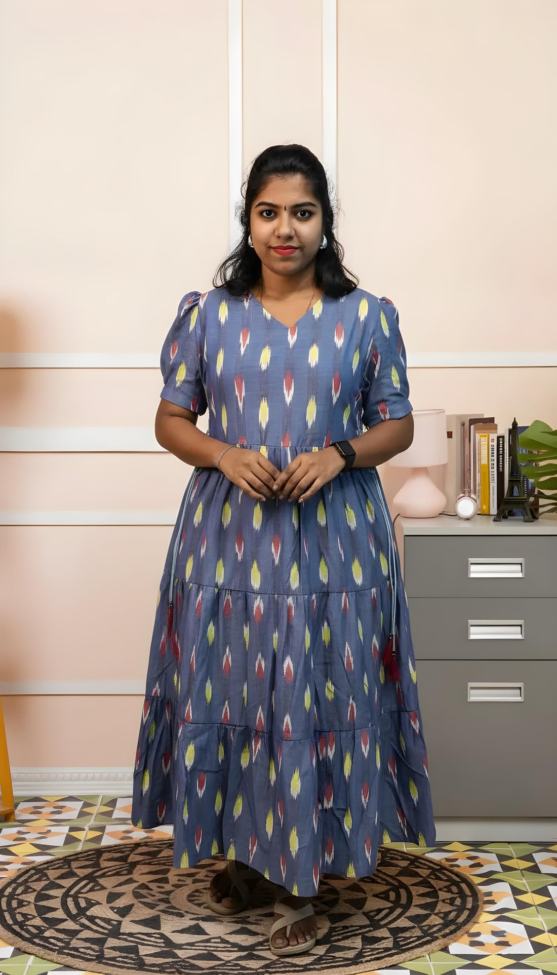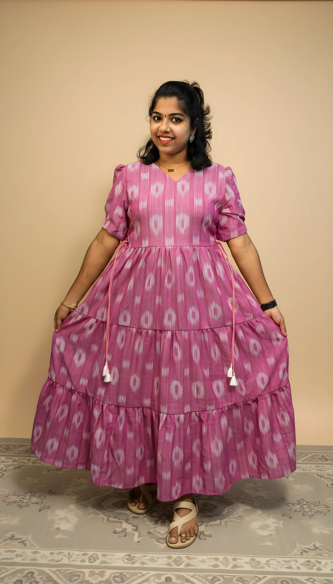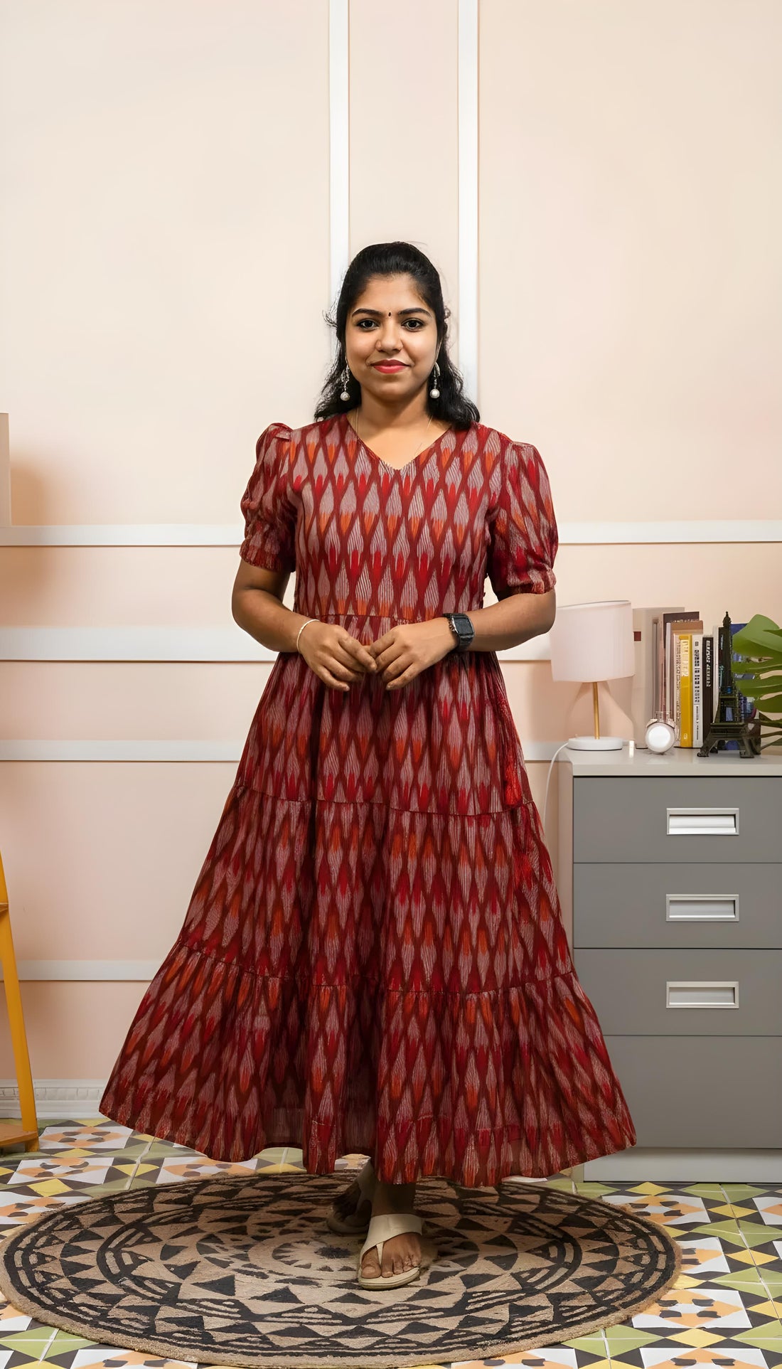 Maroon Ikkat Cotton Three Tier Maxi with Adjustable Side Corsets