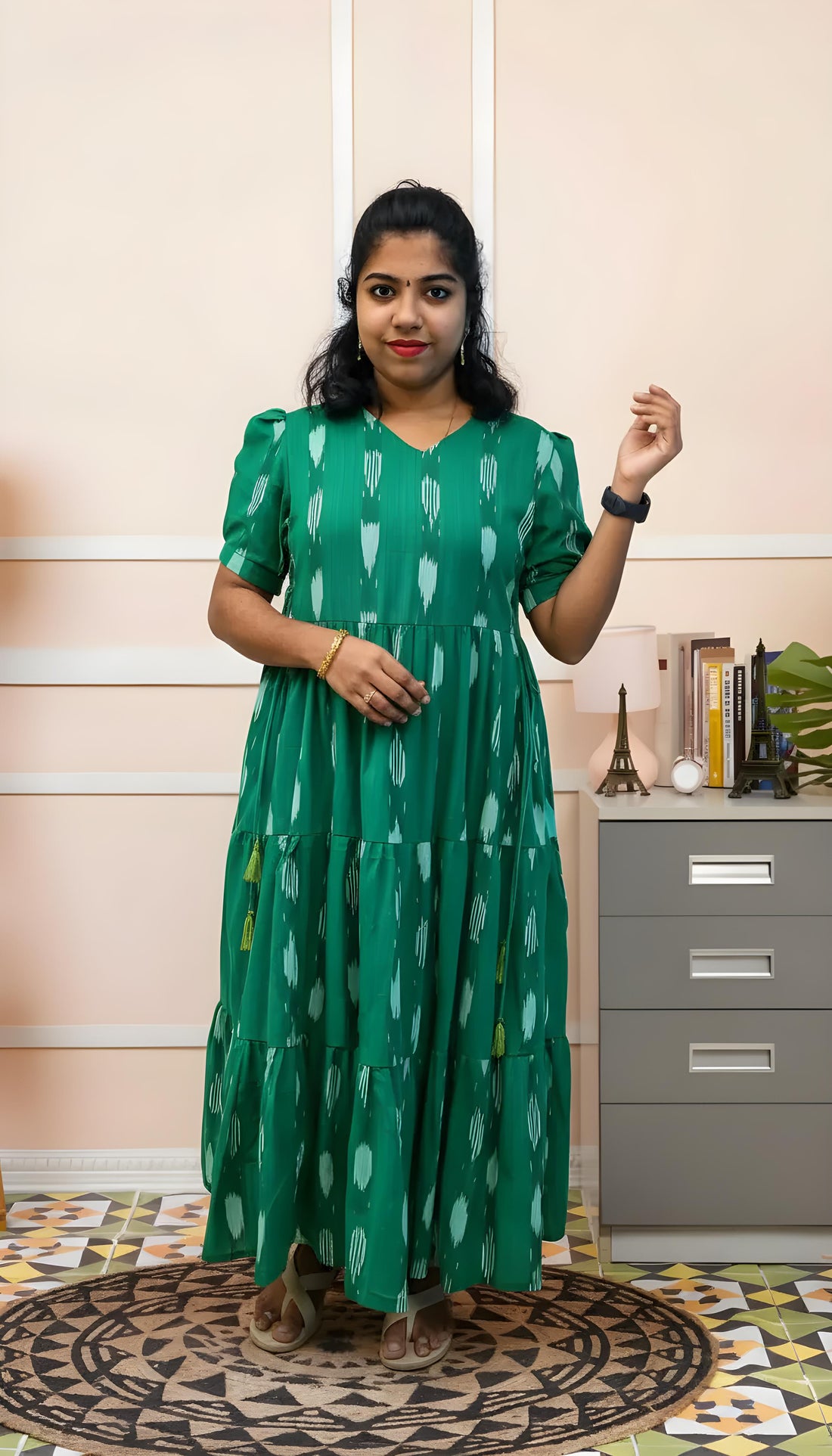 Green Ikkat Cotton Three Tier Maxi with Adjustable Side Corsets