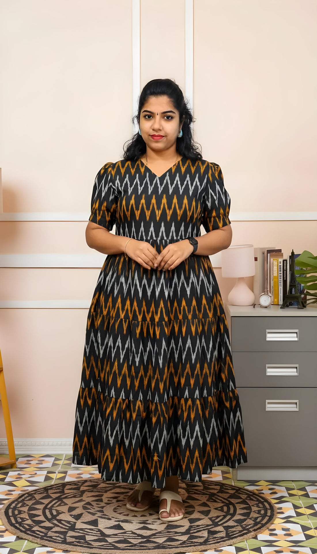 Black Ikkat Cotton Three Tier Maxi with Adjustable Side Corsets