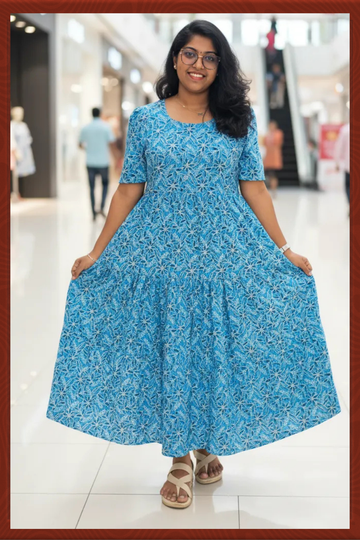 Sky Blue Ikkat Cotton Three Tier Maxi with Adjustable Side Corsets