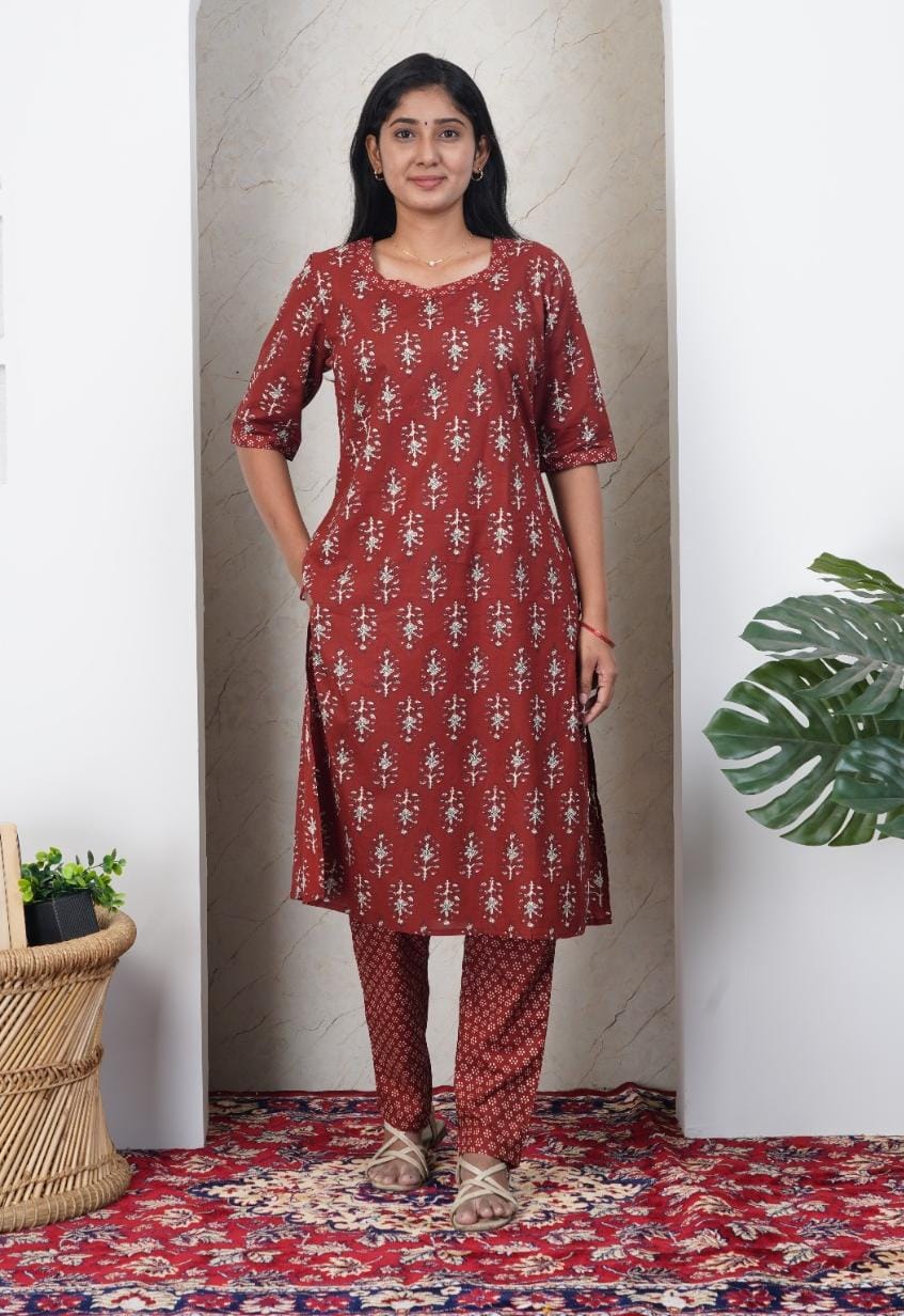 Maroon Soft Printed Cotton Kurta Set for Women | Office & Daily Wear
