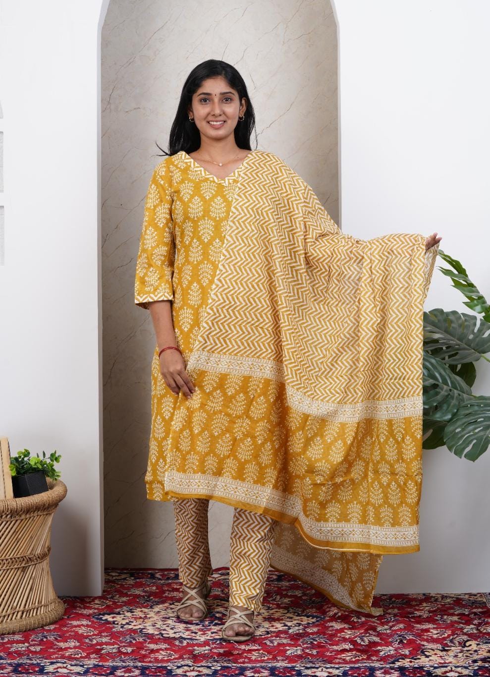 Yellow Soft Printed Cotton 3 Piece Kurta Set for Women | Office & Daily Wear