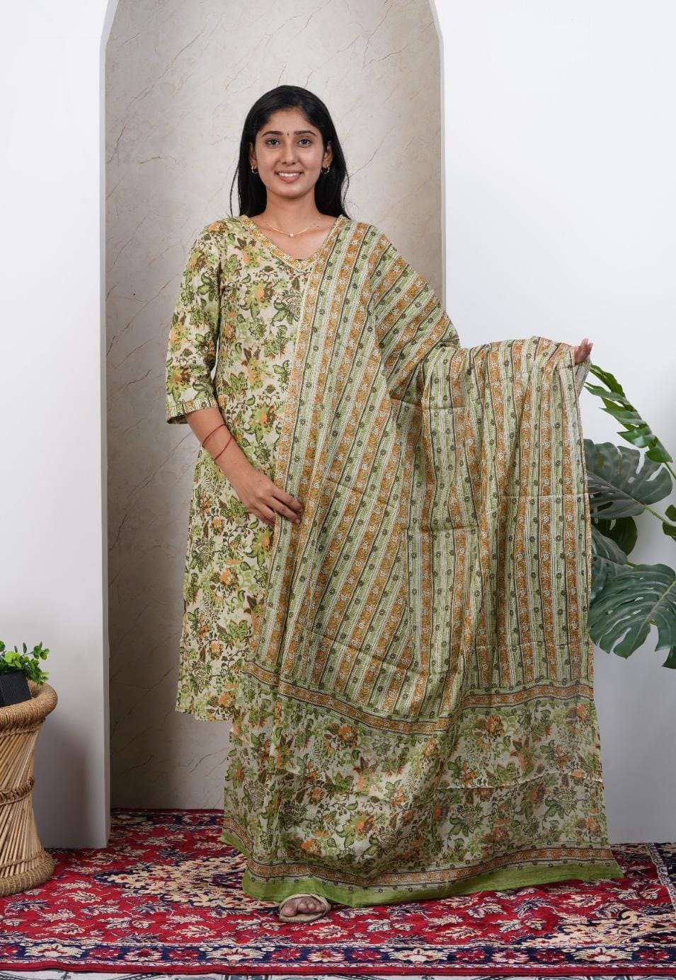 Green Soft Printed Cotton 3 Piece Kurta Set for Women | Office & Daily Wear