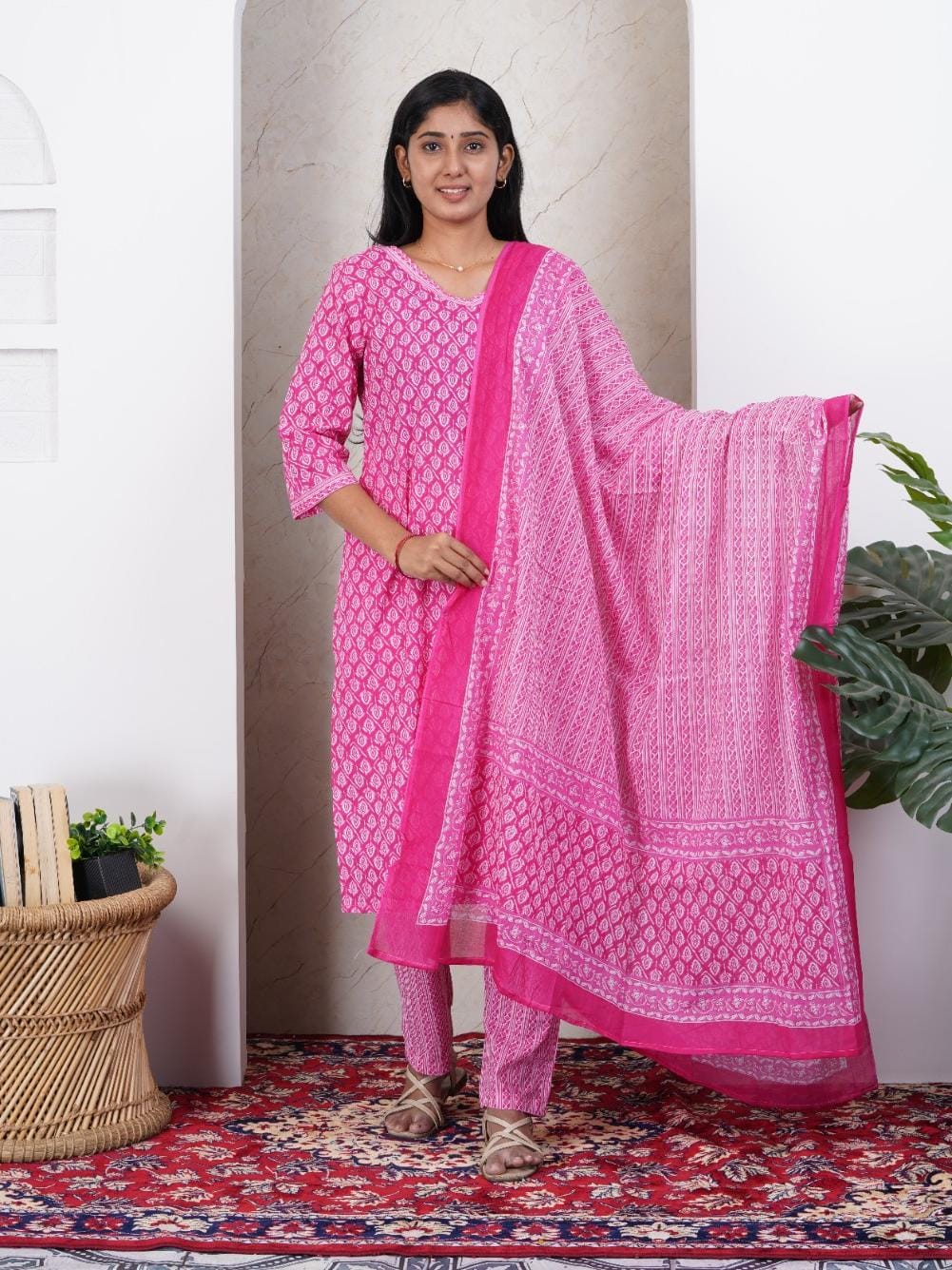 Pink Soft Printed Cotton 3 Piece Kurta Set for Women | Office & Daily Wear