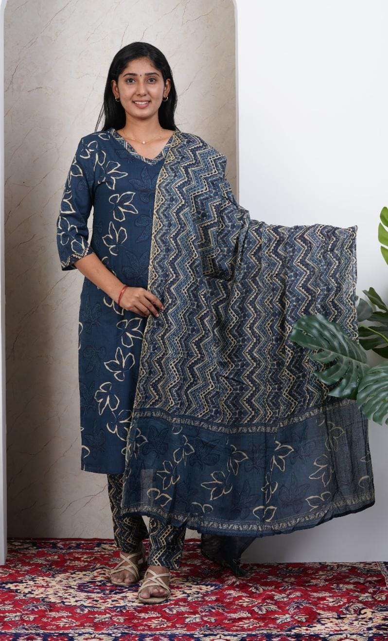 Navy Blue Soft Printed Cotton 3 Piece Kurta Set for Women | Office & Daily Wear