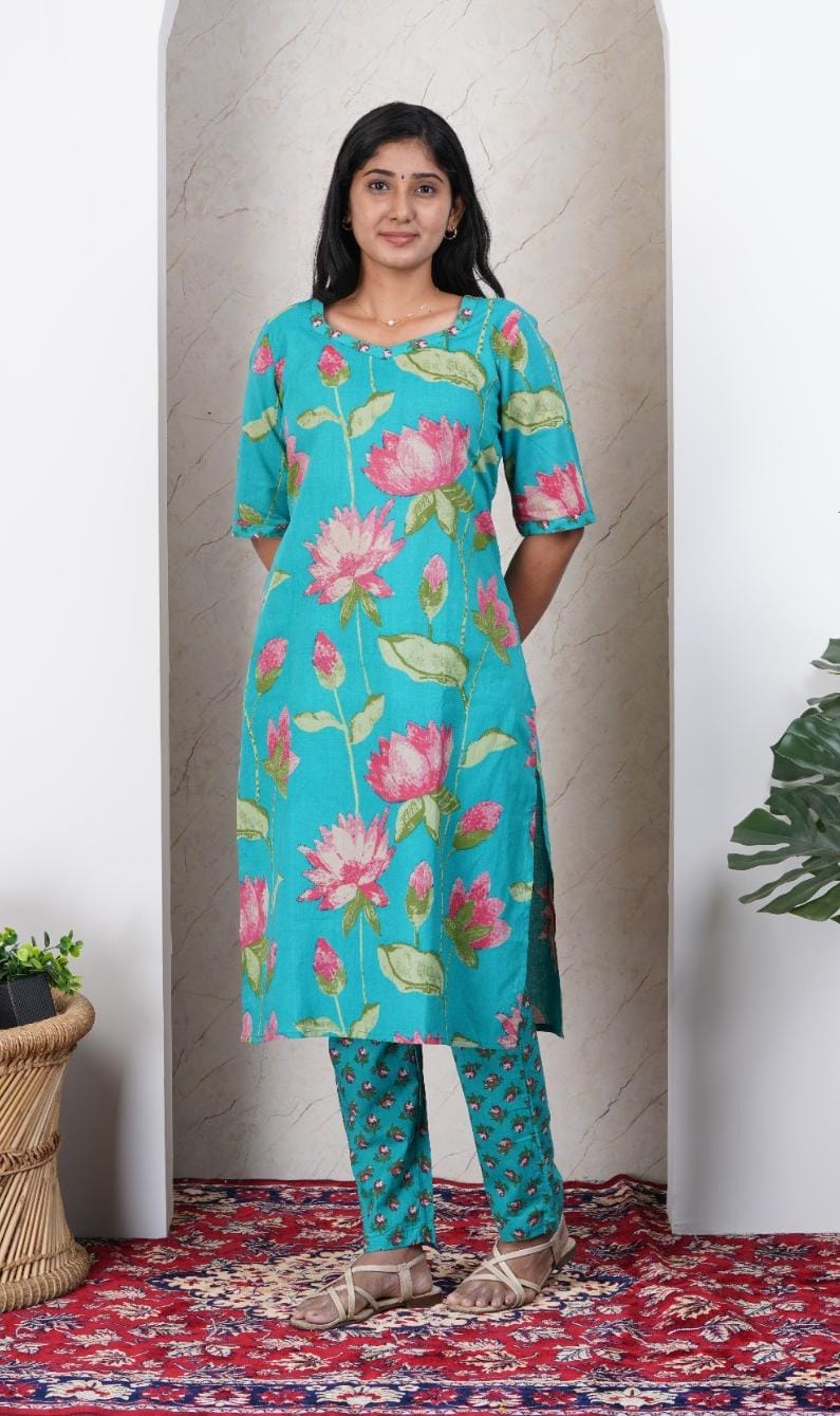 Teal Green Soft Printed Cotton Kurta Set for Women | Office & Daily Wear