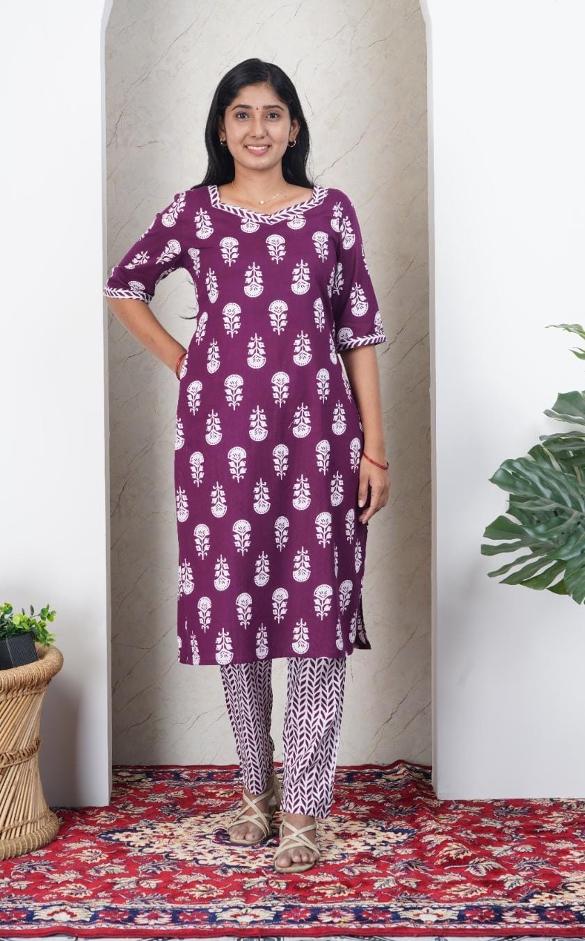 Dark Purple Soft Printed Cotton Kurta Set for Women | Office & Daily Wear