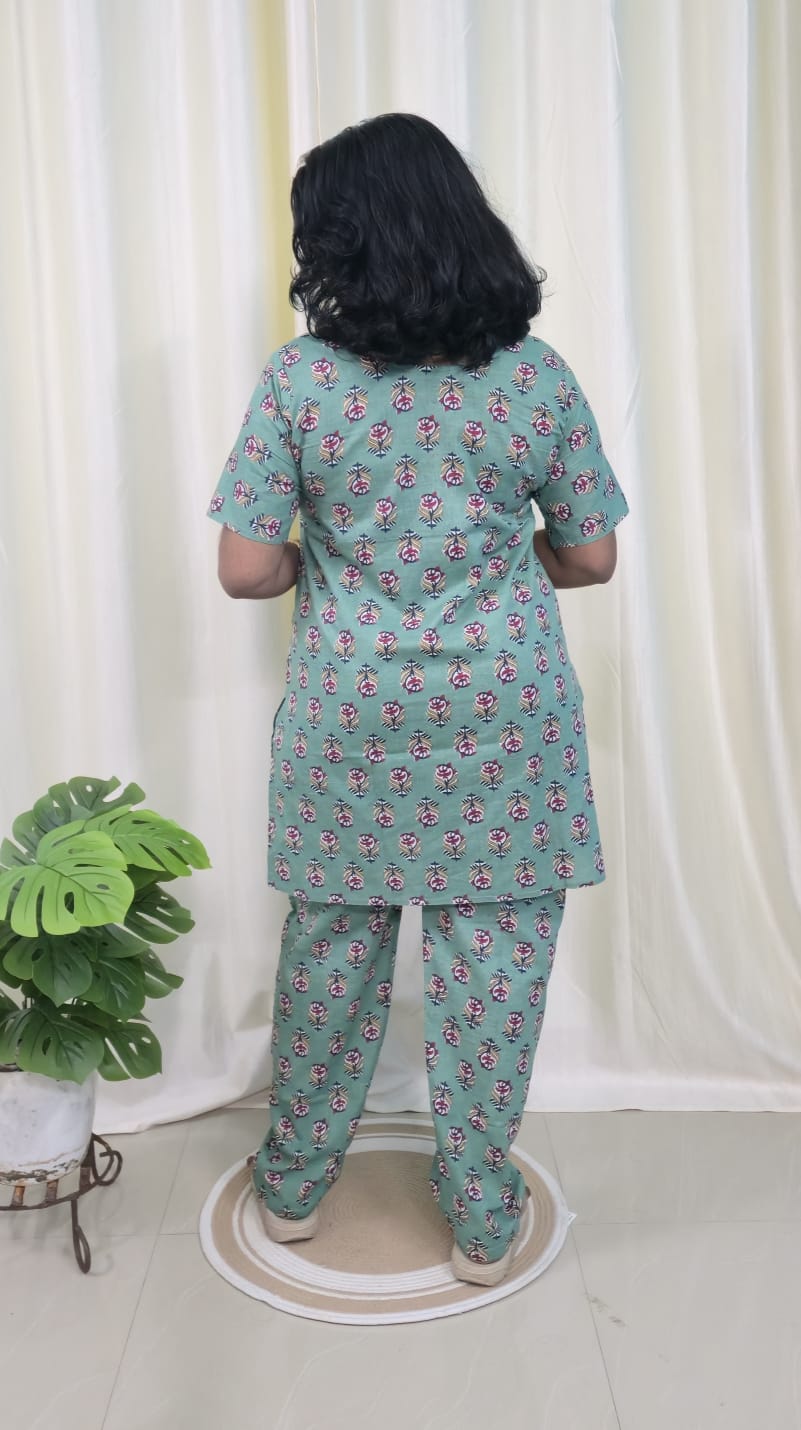 Blue Printed Cotton Mid Length Kurti with Trouser Co-Ord Set